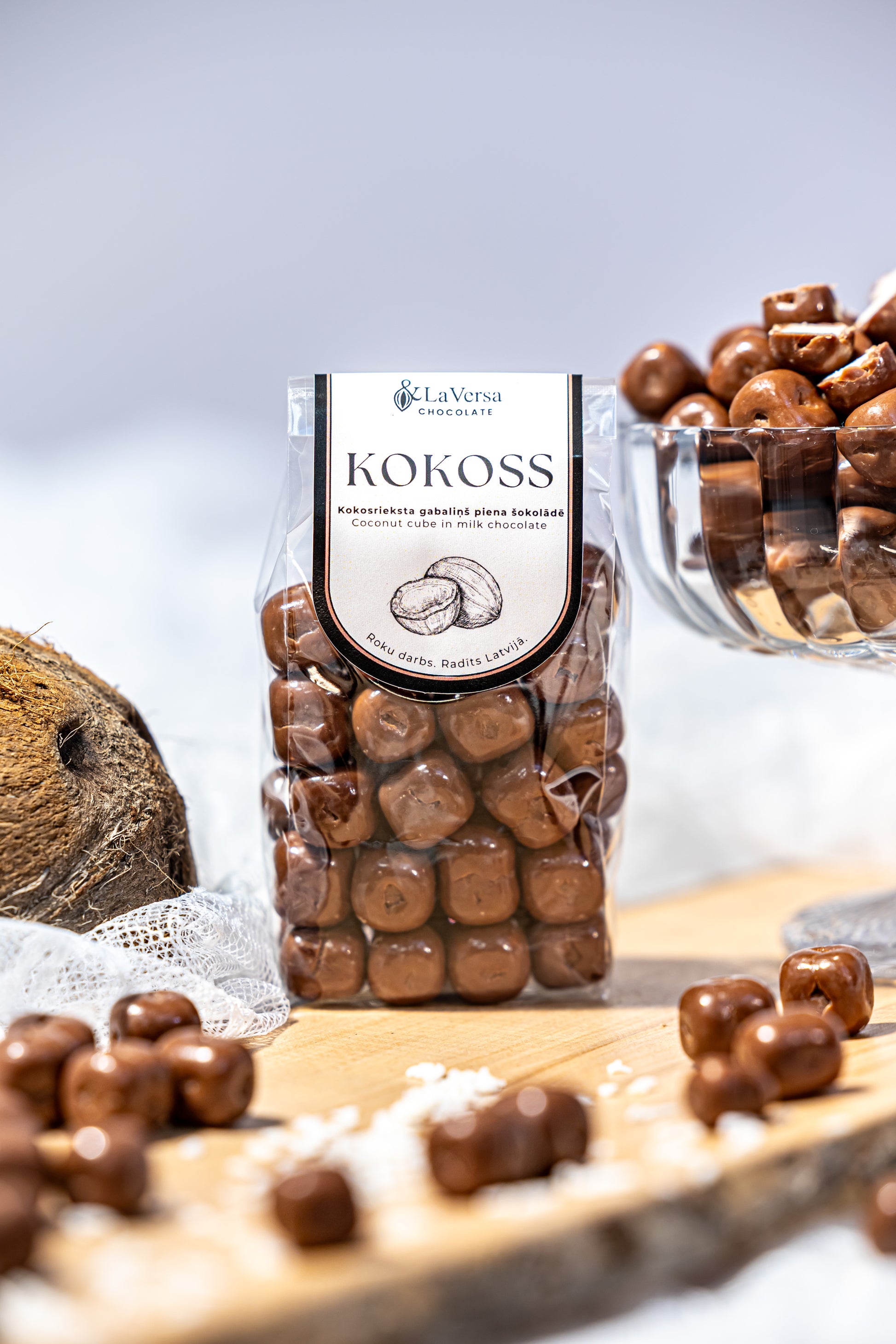 Kokoss – maigais kokosrieksts saplūst ar krēmīgo piena šokolādi, radot silti saldo un tropu garšu baudījumu. Katrs kumoss ir maigs un apburoši salds.
